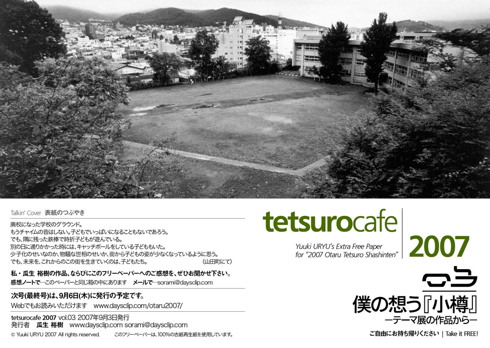2004年から毎年制作している、フリーペーパー『tetsurocafe』。 作品の解説やコラムで構成した、お持ち帰りいただける作品です。 今年も会期中4号を発行しました。 このページでもお楽しみいただけます。各ページをクリックしてください。 *JPEG画像につき、少々お時間がかかります