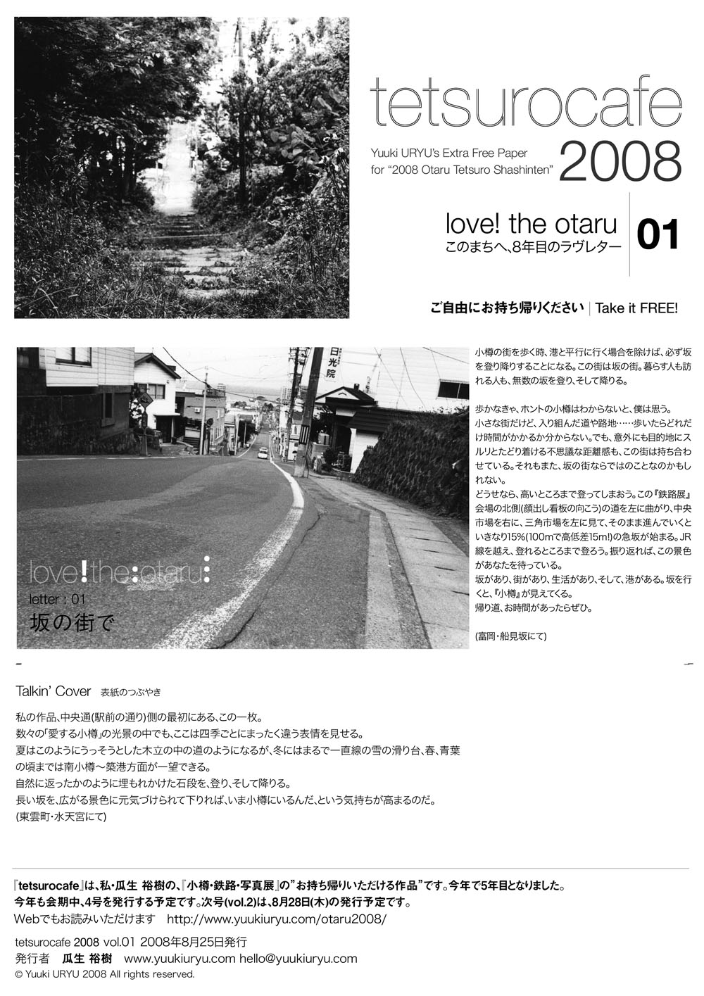2004年から毎年制作している、フリーペーパー『tetsurocafe』。 作品の解説やコラムで構成した、お持ち帰りいただける作品です。 今年も会期中4号を発行しました。 このページでもお楽しみいただけます。各ページをクリックしてください。 *JPEG画像につき、少々お時間がかかります