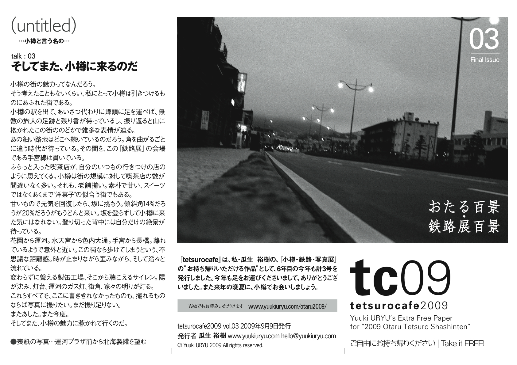 2004年から毎年制作している、フリーペーパー『tetsurocafe』。 作品の解説やコラムで構成した、お持ち帰りいただける作品です。 今年も9月9日発行の最終号まで、全3号を発行しました。 このページでもお楽しみいただけます。各ページをクリックしてください。 *JPEG画像につき、少々お時間がかかります